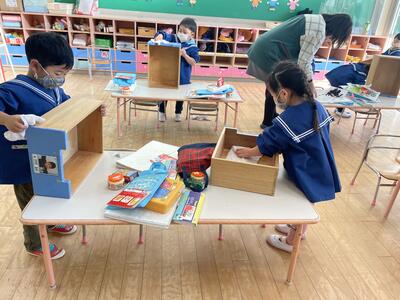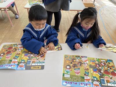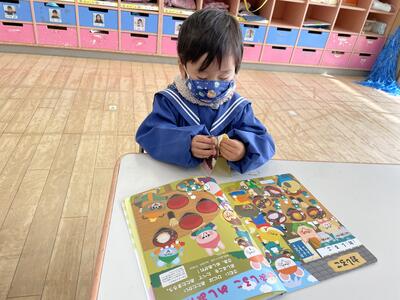 3歳児は月刊絵本のシールを貼っています。