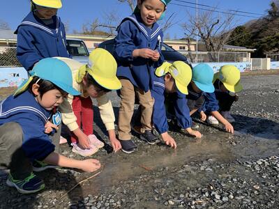 昨日の寒さで水溜りが凍っていることに気づいた子どもたち。