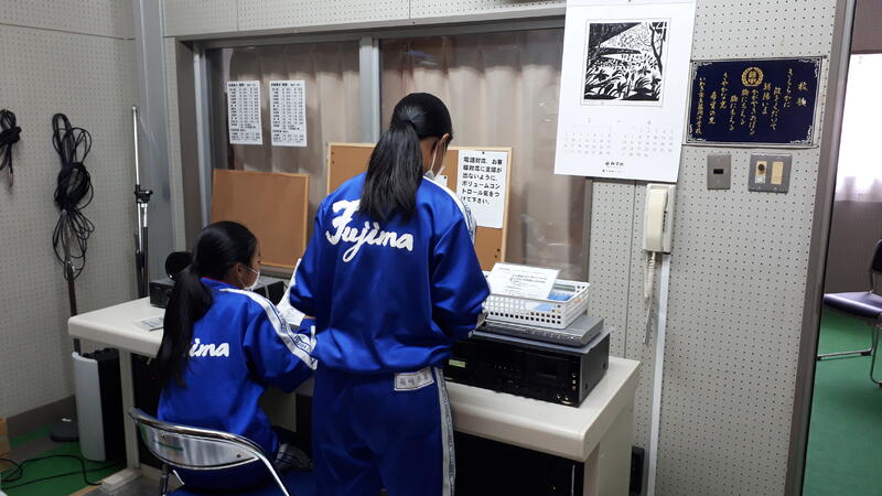 昼食(給食)を持参して、機械操作やアナウンスをしてくれています。