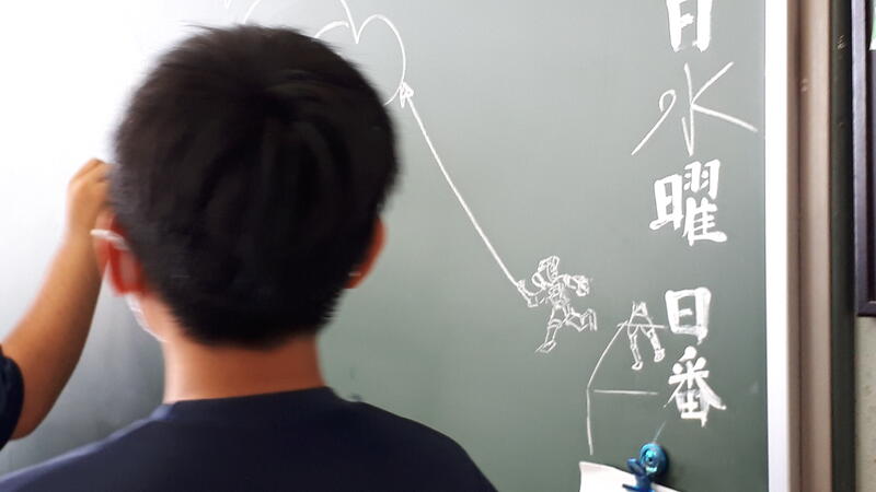 教室の黒板に芸術作品?を描く姿も・・・(まあ、これもアリかな)