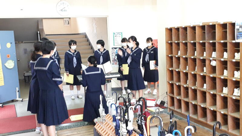 昇降口周辺は声が響くので、練習には最適なのでしょう←諸説あり