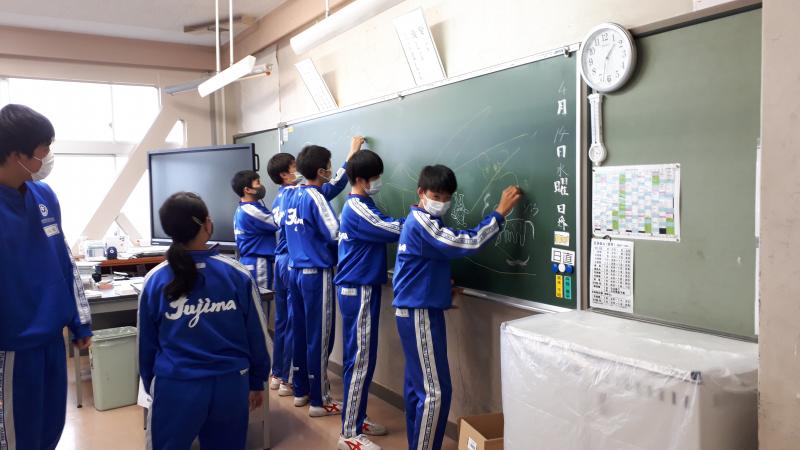 雨なので、昼休みに外に出られなくて黒板に落書き中・・・じゃなくて、イラストを描いてるんですよね。ね!
