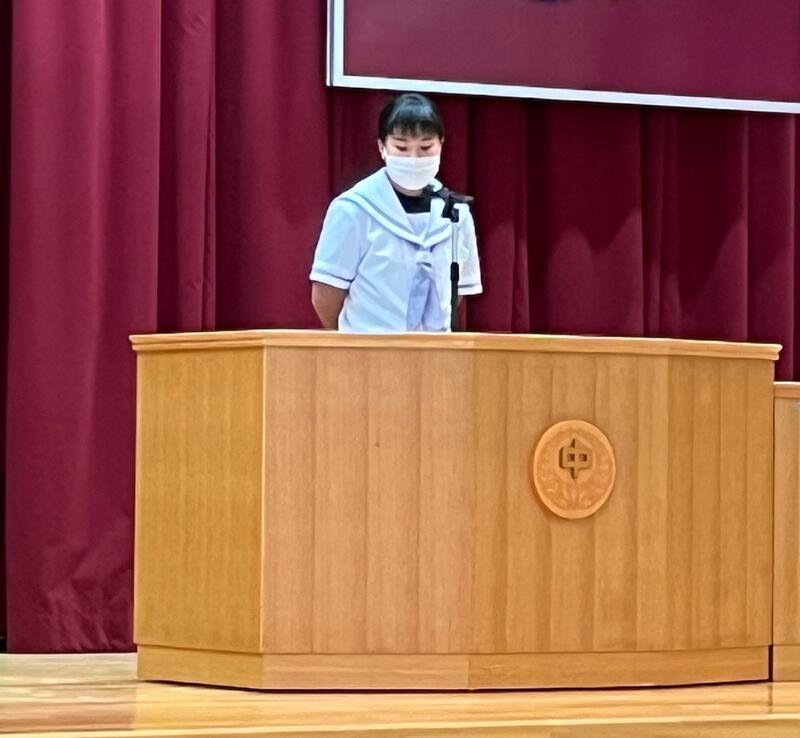 「一学期はクラス替えがあり、新しい友達や先生方との出会いがありました。また、1年生が入学し先輩としての自覚を持った部活動や学校生活ができたと思います。5月からは、マスクを外しての生活に戻りました。音楽の授業で歌を歌うことができ、体育フェスティバルや部活動でも、声出しの応援や円陣を組むことができ、今まで以上に元気に生き生きとした活動ができたと思います。また、マスクを外した友達の笑顔を見ることができたり、新しい面を発見したりすることで、友達との仲が深まったと思います。しかし、学校生活に慣れたことで緊張感が緩み、先生方に注意を受けることもありました。僕たちは今、先生方に対する態度や話し方は2年生としてどうなのか、授業に積極的に取り組んでいるのかなど、先生から問いかけられています。僕もその場の雰囲気に流されてしまい、委員長の役目を果たせなかったことを反省しています。2年生の行動を1年生が見ているということを意識し、けじめのある態度や生活を心がけていきたいと思います。