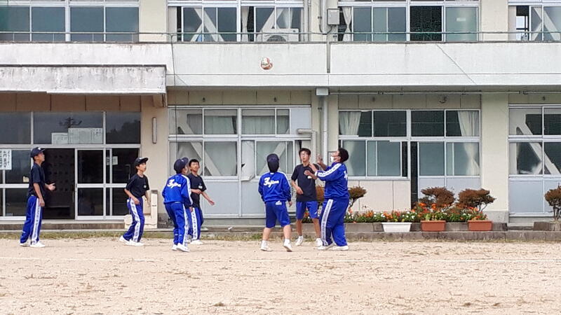 1年から3年のバレーボール部員が仲良く円陣パス。