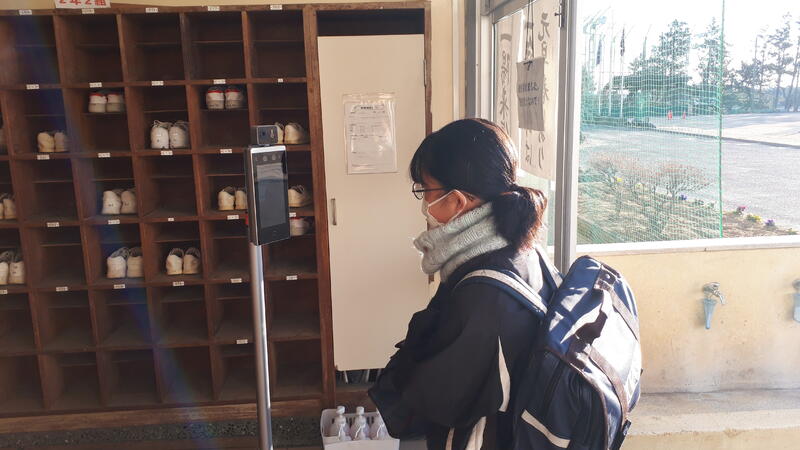 ↳これは去年の夏から。自動検温マシーンが登校者の体温を測定しています。