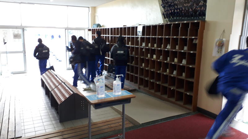 生徒たちはにこやかです。これはテニス部のルーティーン(コートならし or 空気充填)の後かな。