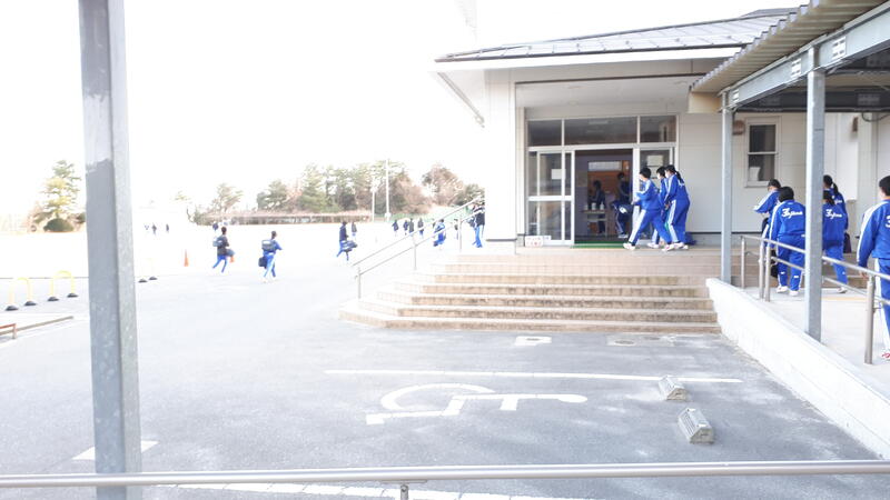 ↳校庭へ向かう1、2年生と体育館へ向かう3年生。