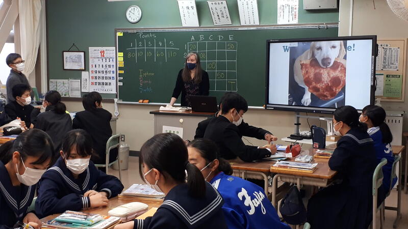 ALTの先生が、2学期に習った英文を使って問題を出しています。