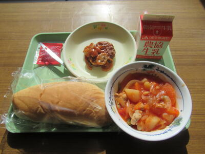 今日の給食の献立は、コッペパン・牛乳・苺ジャム・ハンバーグ・ソースかけ・鶏肉と豆のトマト煮です。総カロリーは、615㎉です。