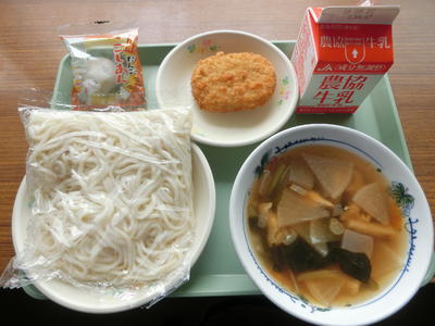 今日の給食献立は、塩けんちんうどん、牛乳、かぼちゃコロッケ、お月見団子です。