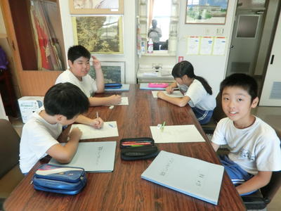 算数ジュニアオリンピックに出場するチャレンジャーは、結成式後に自分のペースで頑張り始めています。週に2回は校長室で問題に挑戦し、互いに解説をしながらゼミのように進めていきます。午前8時までの練習風景です。