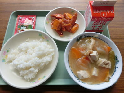 本日の給食献立は、ごはん、野菜ふりかけ、牛乳、厚揚げとウインナーのチリソース炒め、玉ねぎの味噌汁です。