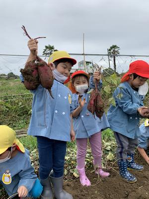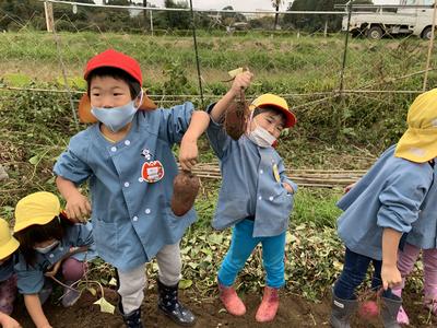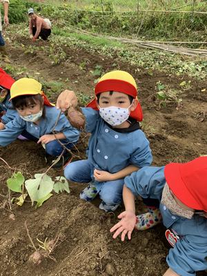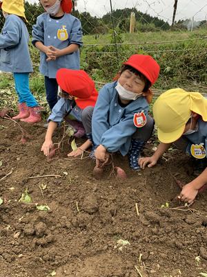 7月にじゃがいも掘りを経験し、10月上旬に園の畑でさつまいも掘りを経験したことで、掘りかたのコツが分かってきた様子が見られました。また、7月のときは土を触ることを嫌がったり、虫がいるからと離れたところから見ていた子も、今回は積極的に参加することができていました経験を積み重ねることの大切さを改めて感じました
