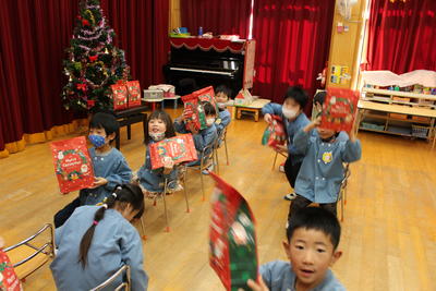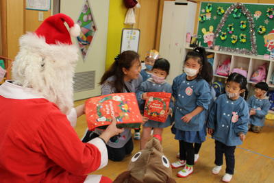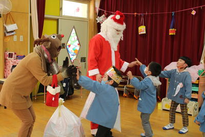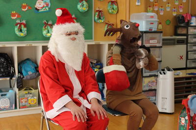 お楽しみ会に登場してくれたのは、サンタクロースとトナカイ。(ご協力いただいた保護者さん、ありがとうございます。)年少のもも組さんの中には、あまりのリアルさに驚いて、泣き出してしまう子も。でも、プレゼントをいただけると分かって、「にっこり」でした。