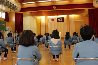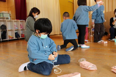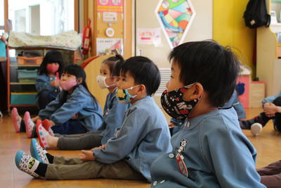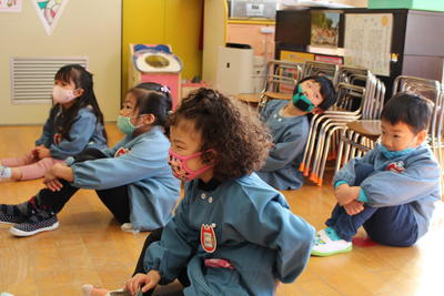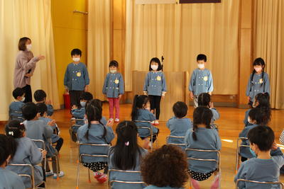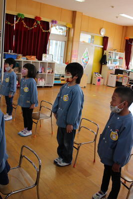 もも組さんは、お帰りの前に「冬休みに家のお手伝いをしたこと」を発表しました。お洗濯をたたむお手伝いをしたこと、家族の靴をそろえたこと等々、終業式でお約束をした手伝いができました。