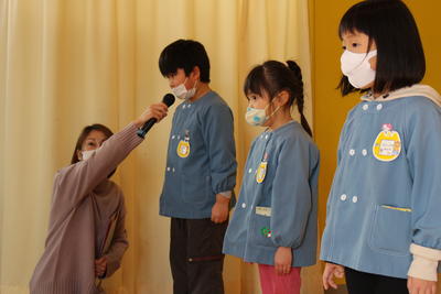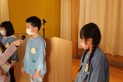 2021年1月8日 11時30分藤原幼稚園の令和3年、そして第3学期が始まりました。今日は始業式の中で、ちょう組さんの代表個人発表を設定しました。(式の際に、自分の言葉で発表することを位置づけています。)今回は、第3学期にやってみたいこと挑戦したいこと、そしてがんばることの発表です。