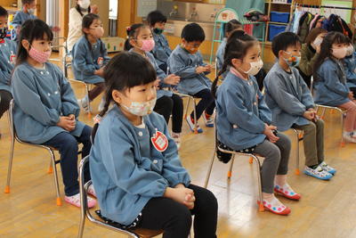 もも組さんとうめ組さんにとって、あこがれのちょう組さんの姿でした。始業式の話を聞く態度や呼名された時の「はい」の返事も大変よくできました。とってもよいスタートが切れました。