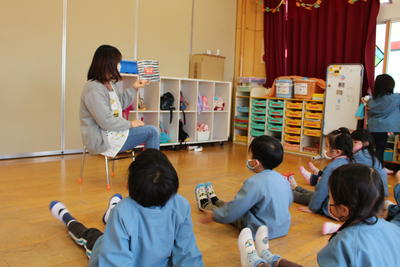 うめ組さんは、先生からの絵本読み聞かせです。明日から3連休になりますが、コロナ対策をしながら安全にすごしてください。