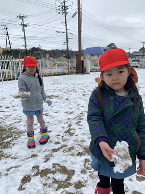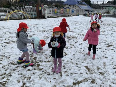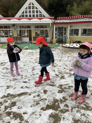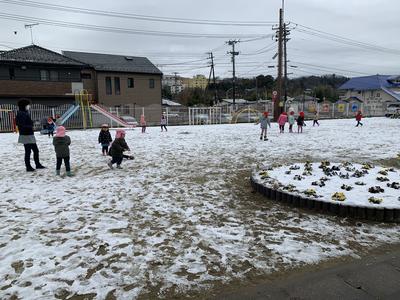めったに降ることのない雪に大喜びの子ども達は、雪だるまを作ったり、雪合戦をしたりしながら楽しく遊んでいました