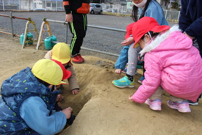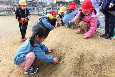 職員室前にあった「盛り土」を笹島様達のご協力により、移動していただきました。その後、撤去の要望がありましたらいつでも対応しますと心強い思いを伝えいただきました。どうしようかと悩んでいましたが、さすがは園児達です。絶好の遊び場に変身していました。