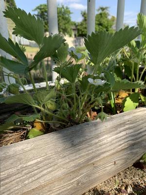 こちらはみんなが大好きなあの赤い果物の赤ちゃんです白いお花も咲いています