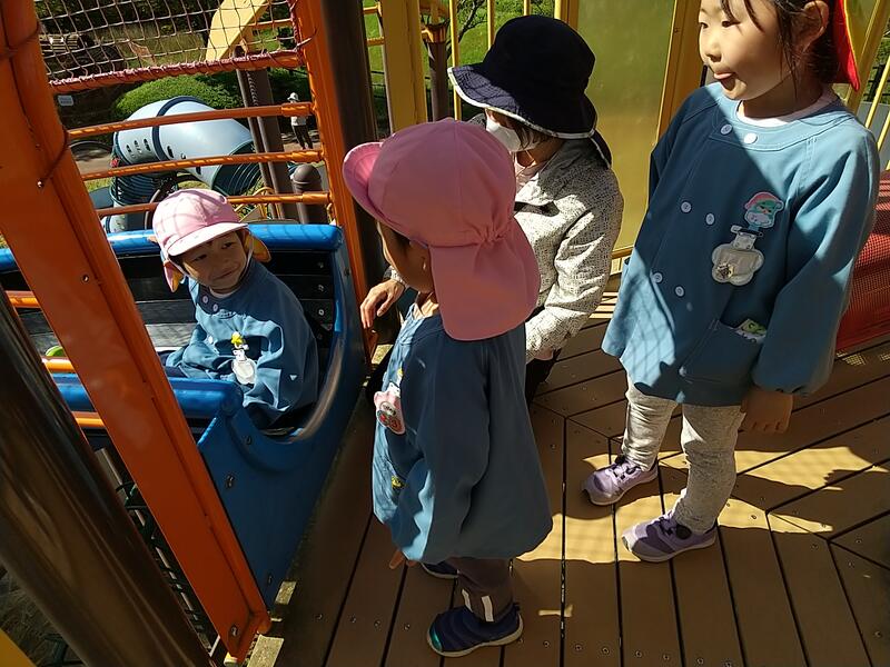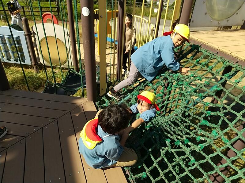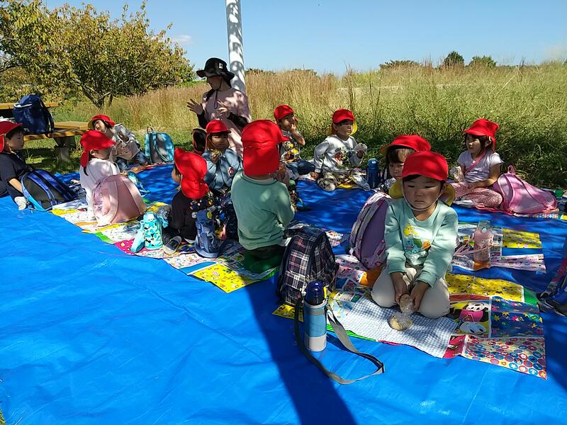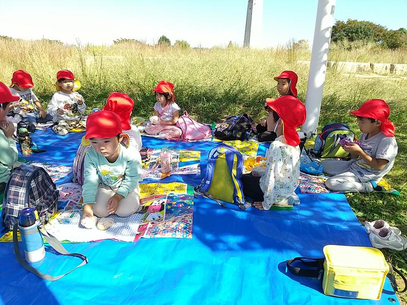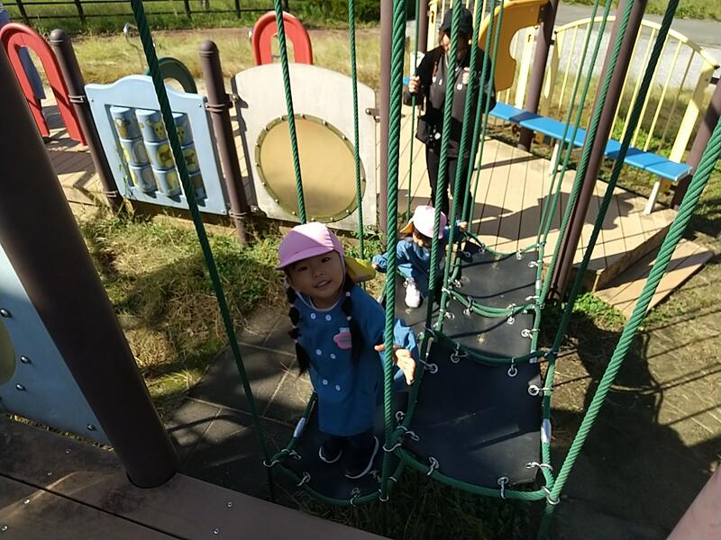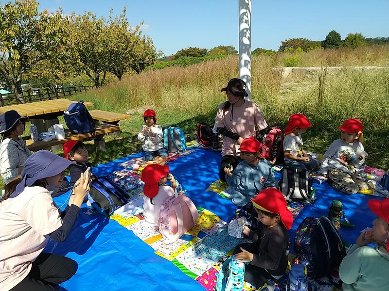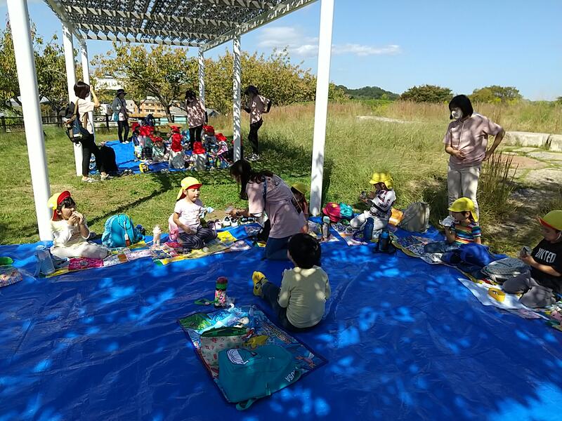 もも組さんは、保護者の皆さんも同伴でバスで行ってきました。遊具で遊んだり、虫捕りをしたり、おにぎりを食べたりと、楽しく過ごすことができました。