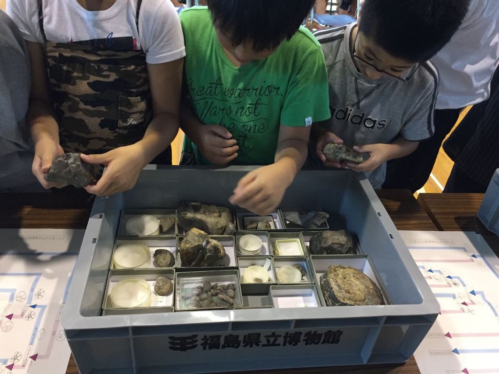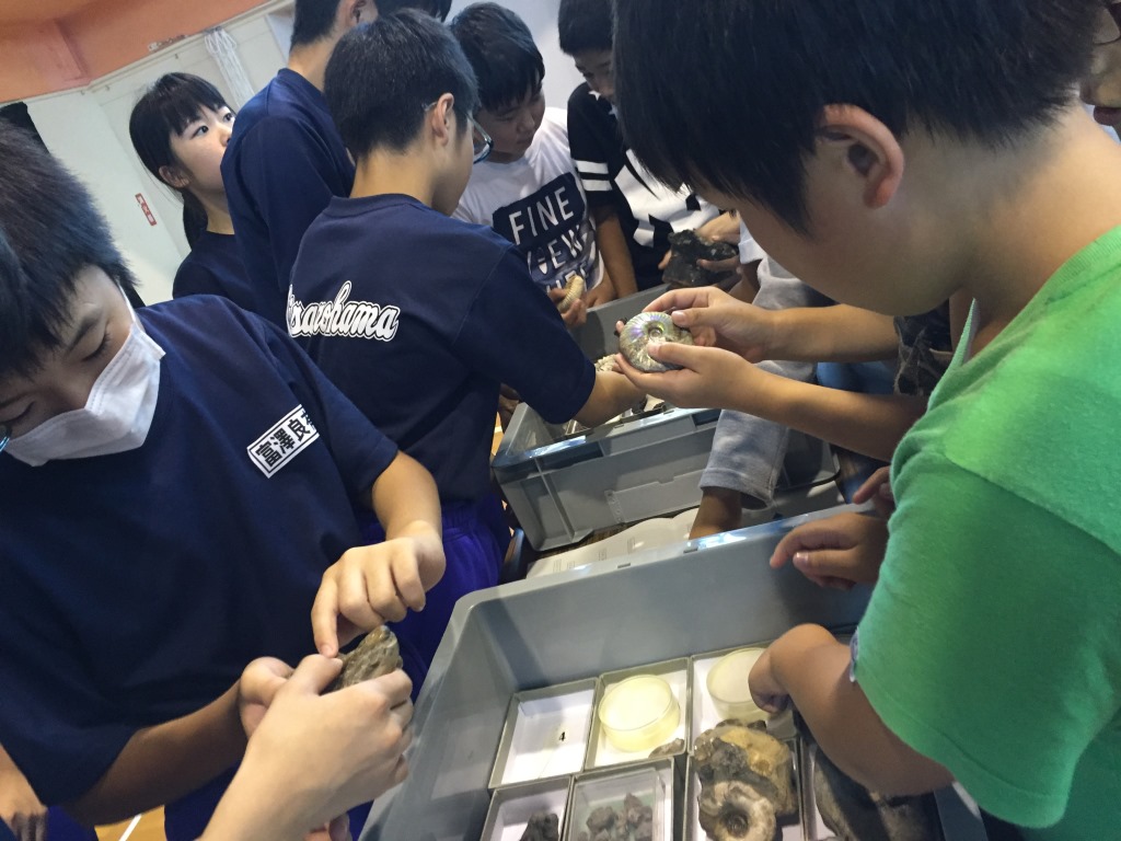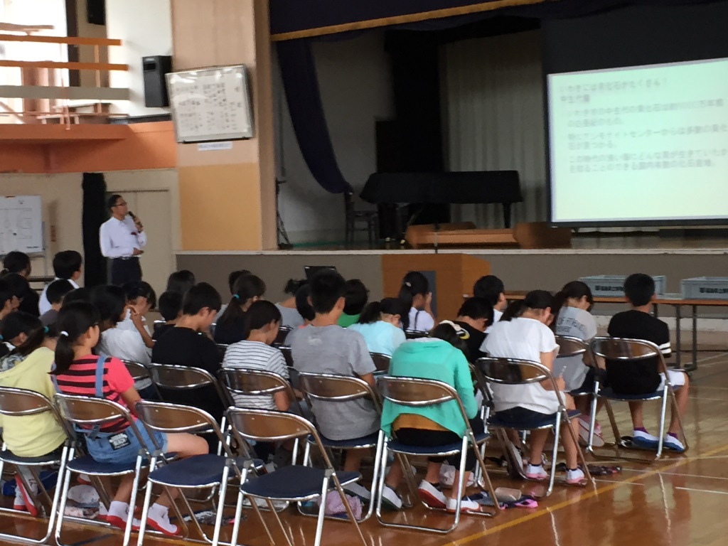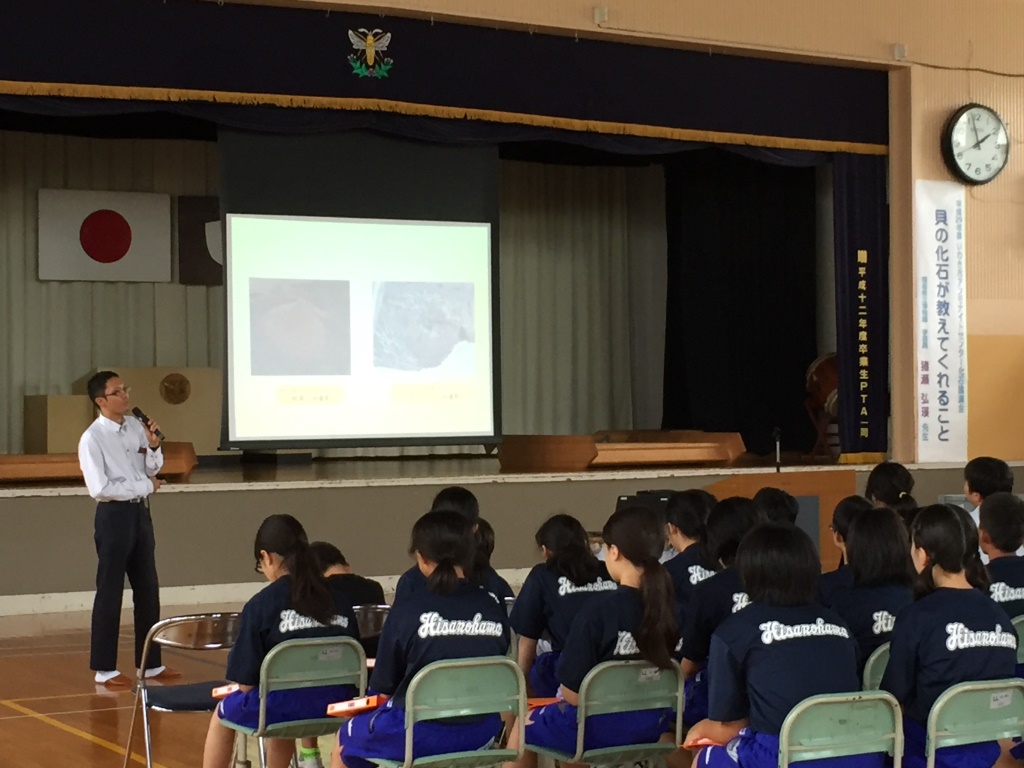 2017年9月6日 12時29分 本日9月6日(水),久之浜中学校区小中連携推進事業の一環として,いわき市アンモナイトセンター主催の「化石講演会」を本校体育館で開催中です。