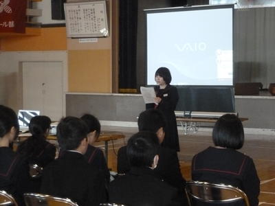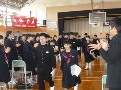 本日1・2時間目に、新入生に久中の学校生活のきまりや生徒会・部活動等の活動を紹介するために、対面式が行われました。新入生は、学校生活のきまりや生徒会の活動がどのように行われているのか、理解しようと上級生の発表をよく聞き、よく見ていました。対面式のために生徒会役員・各部の部長・応援団の皆さんが中心となって、準備をしてくれました。