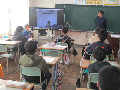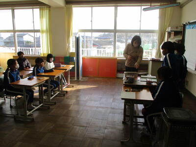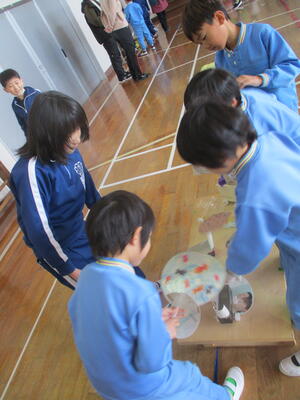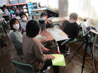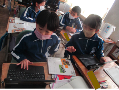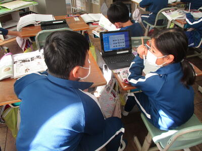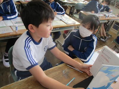 2年生は、冬休みの宿題だった動画撮影を、友達同士で見合っていました。「上手にとれてるかな?」