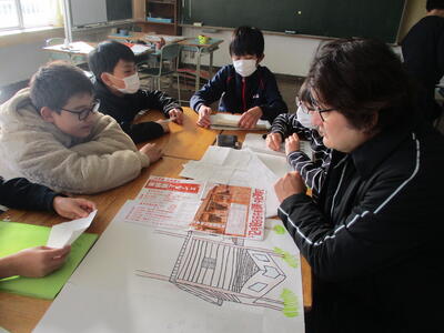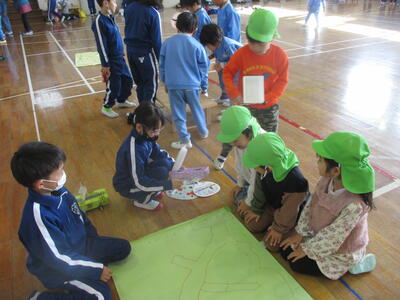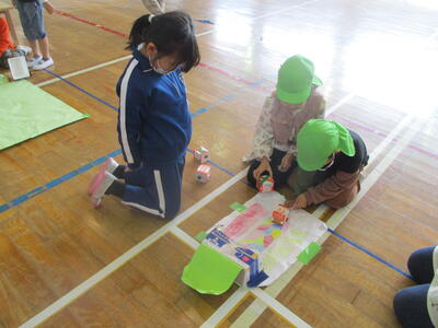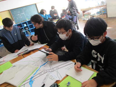 グループに分かれて、大きな地図に避難できる場所や安全な場所、危険な場所、車が通る場所などをペンで書き込んでいきました。