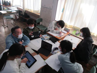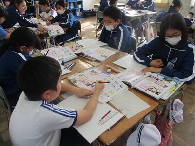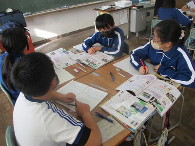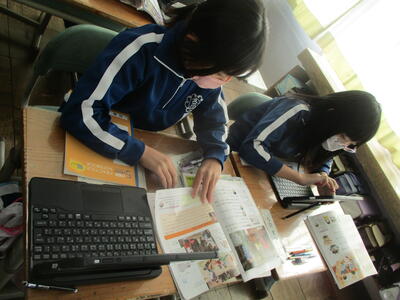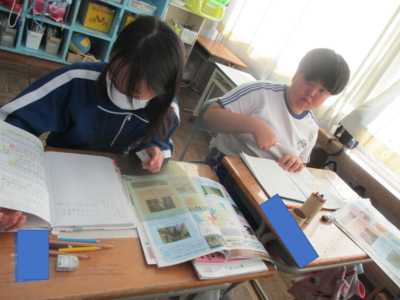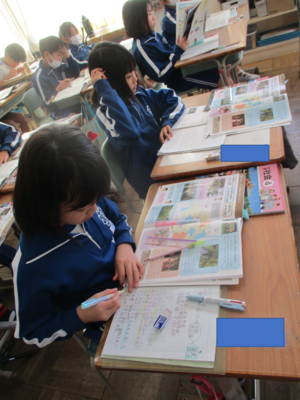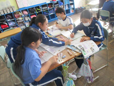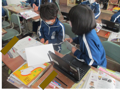 6年生は社会科。グループごとに調べた日本と関係の深い国々について、発表する準備中です。