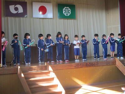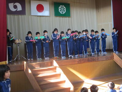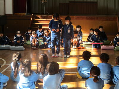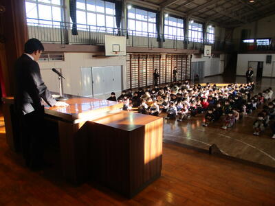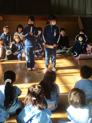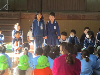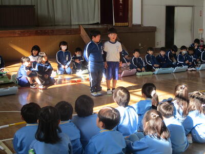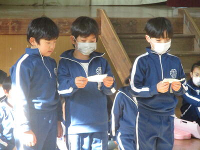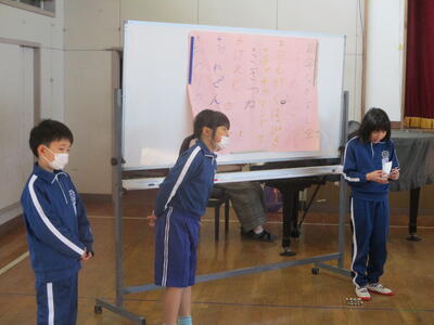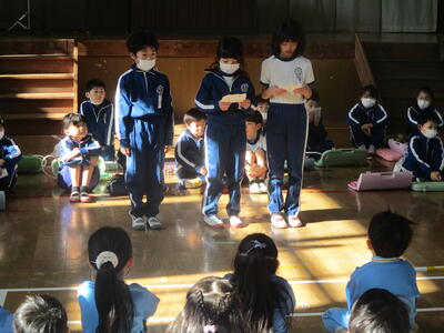 今日の児童集会では、はじめに1年浅野君、3年四條君、5年坂本さんの作文発表がありました。