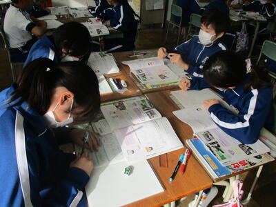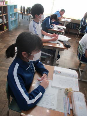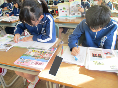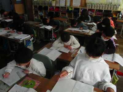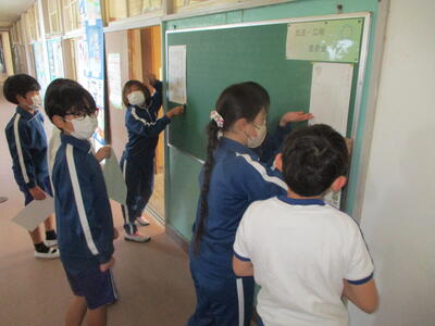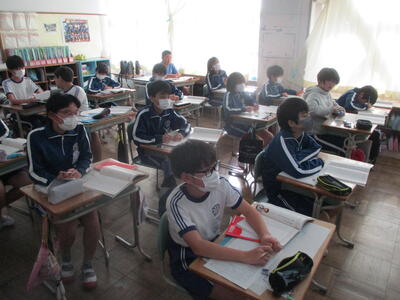 5年生は国語科「意見文を書こう」。様々なテーマで、自分の意見をしっかりとまとめています。