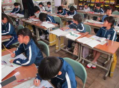 4年生は花さき山の学習中。友達の良さやありがとうの言葉で、久之浜一小バージョンの花さく木の完成です。