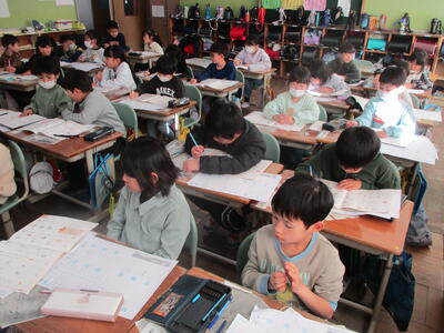 ドリル・パワーアップタイムでは、6年生が2月の学力テストに向けて、算数科の総復習に取り組んでいました。