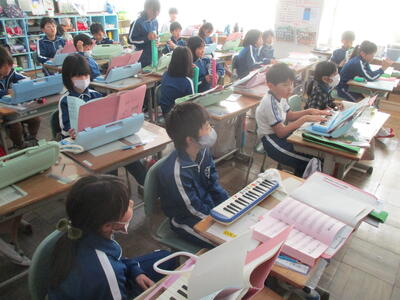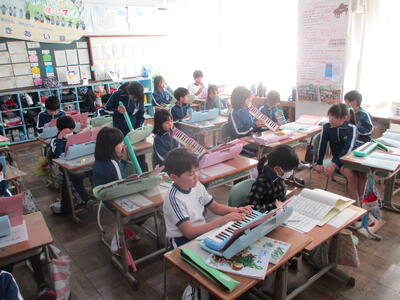 1年生は、音楽室でグロッケンの練習中でした。きれいな音が出ていました。