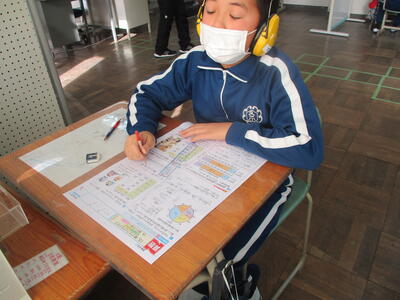 5年生は音楽の鑑賞中。様々なアンサンブルがあることを学び、実際の演奏をノリノリできいていました。