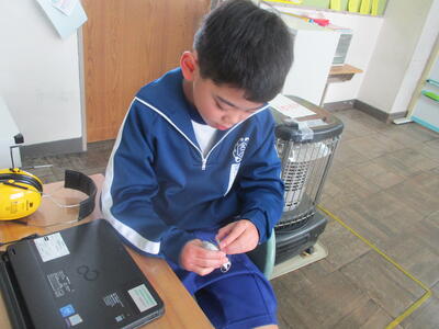 3年生は理科。自分達で調べた電気を通す物と通さない物を確かめています。