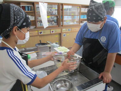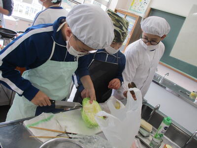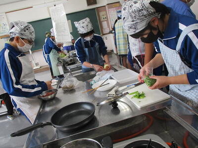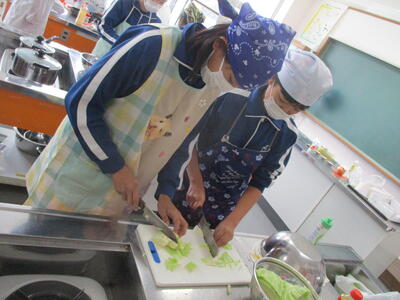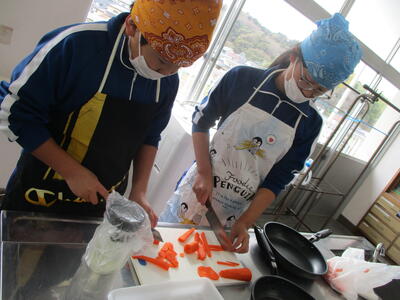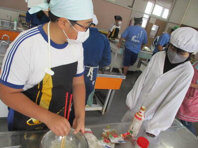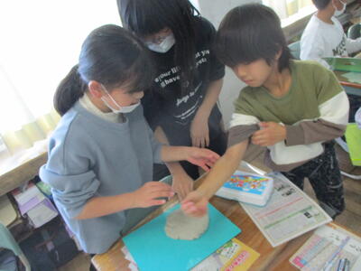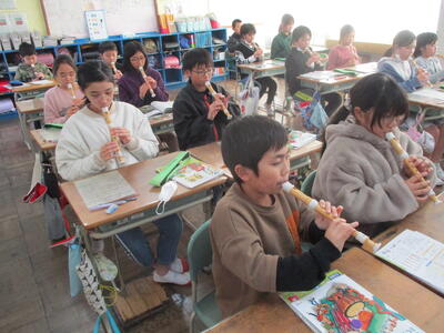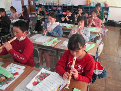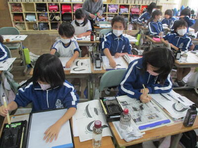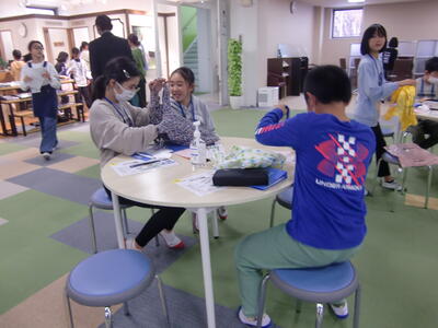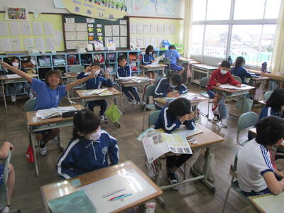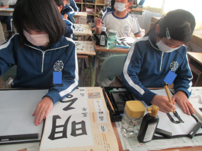 5年生は家庭科でミシンに挑戦中。練習布をグループで教え合いながら縫いすすめていました。なかなかに上手です。