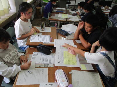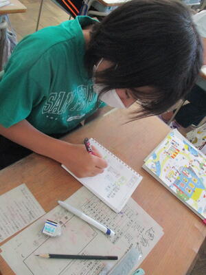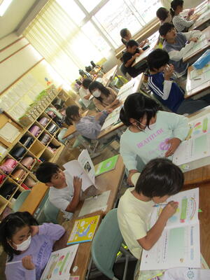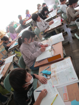 「自分の経験を思い出して・・・」「身のまわりで見つけた秋を・・・」「枕草子にならって自分が感じる秋を・・・」といったように、学年ごとに少しニュアンスは違いましたが、4人とも自分で見つけた秋を文章に表すことができました。