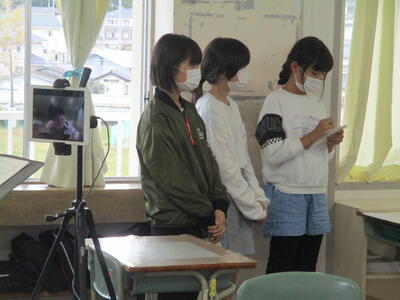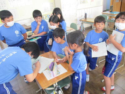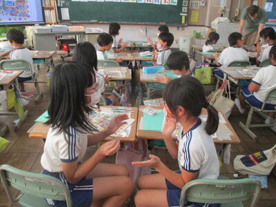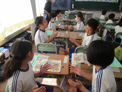 6年生は外国語科。カードを作成し、そこに書かれた文章を暗記しようと何度も繰り返して練習していました。