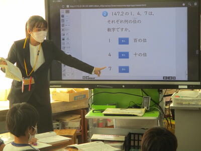 今日は、「『小数第一位』を知り、小数の位取りの仕組みや数の構成を理解する。」を本時の目標として、3年生の算数科の授業を行いました。