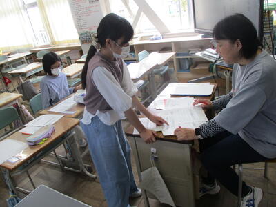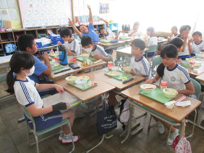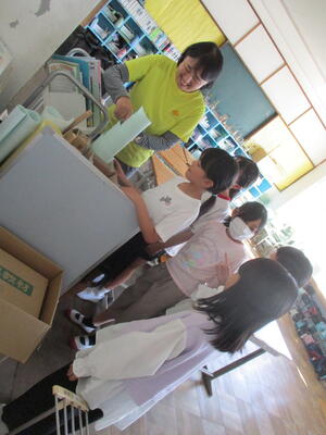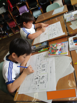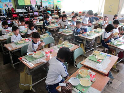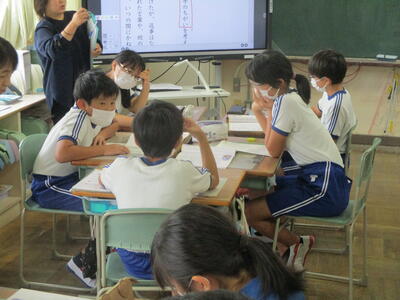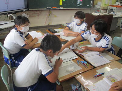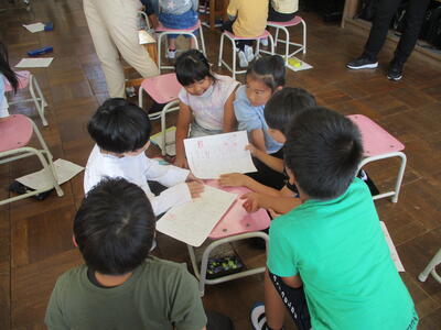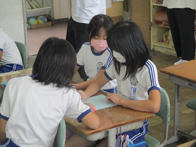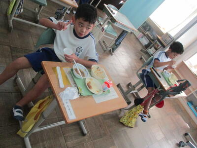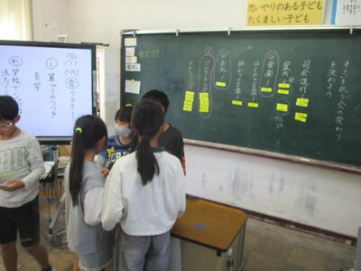 次に、嫌いな食べ物があったらどうするかについてグループで考えました。「好きなものにまぜて食べる。」「細かくして食べる。」「牛乳と一緒に飲み込む。」など、様々なアイディアが出され、嫌いな物があっても完食できるように努力していこうという態度が多く見られました。