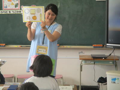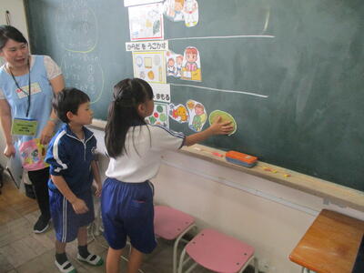 今回は「バランスよく食べよう」というめあてで、食品が赤、黄、緑に分類され、それぞれに大切な役割があることを教えていただきました。