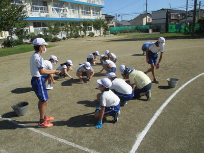 草むしりと石拾いを行い、当日も練習でもケガをしないようにしました。
