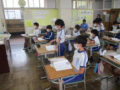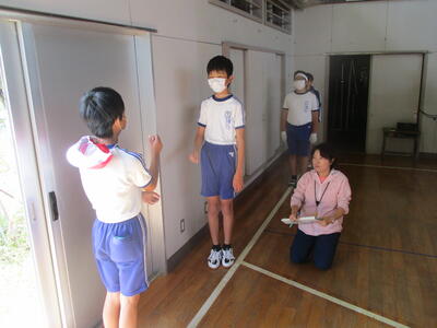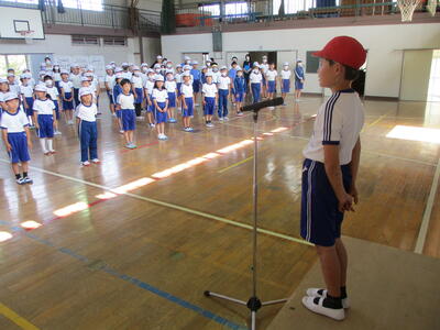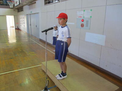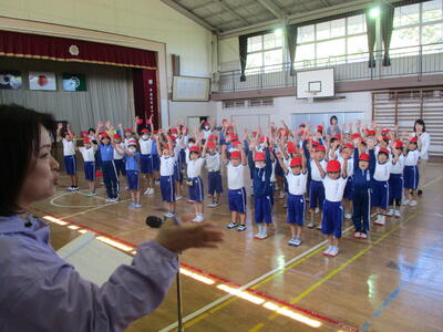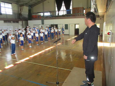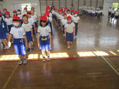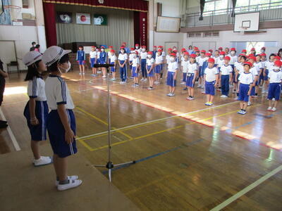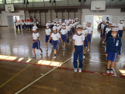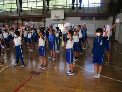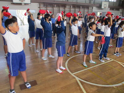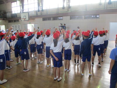 今日の3校時に、運動会の全体練習を行いました。強風のため、体育館でできる練習をしました。