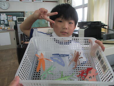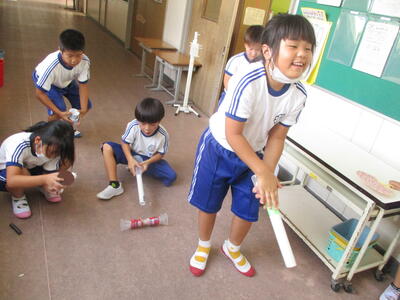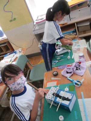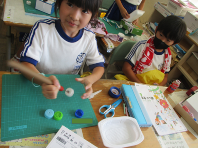 2年生は生活科のおもちゃづくり。磁石やゴムを使う児童もいるなど、とても楽しそうなおもちゃがいっぱいでした。