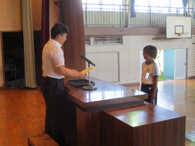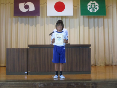 はじめに、「サーフィン大会キッズ部門2位」の4年猪狩君に賞状伝達をしました。猪狩君、おめでとうございます。