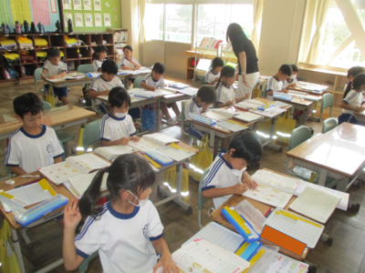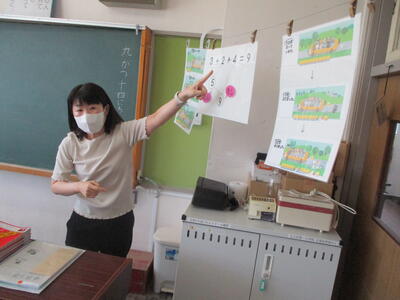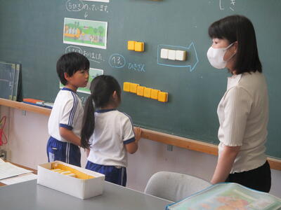 1年生は算数。金曜日の続きで10より大きい数のたし算・引き算に取り組んでいました。