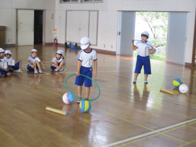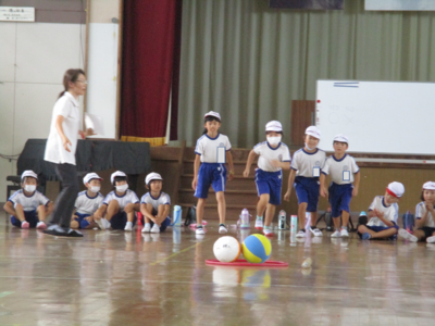 今回の授業は、「I'm playing ~.」といった運動に関する学習でした。